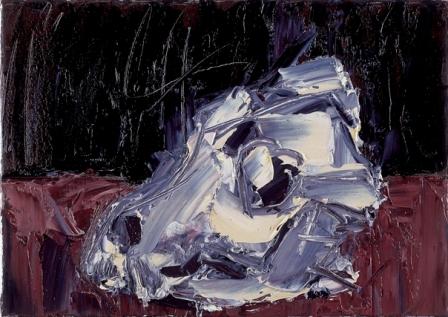 זה טבע דומם יוצא דופן ברפרטואר של קרמר. זו גולגולת דרמטית, מצוירת באימפסטו לבן. הדבר הבולט בה הוא הניגוד בין המוטיב ובין פעולת הציור. כלומר, מוטיב מת שנבנה בחיוּת גדולה. את שיני הגולגולת המקורית מחליפות "שיני" אימפסטו שאפשר לגעת בהן. הן כביכול עברו מן המוטיב, מן הזאב הטורף, אל היד המציירת ואל המדיום. הציור הוא "הזדאבות": נטילת רוח האובייקט ומטמורפוזה שלו אל ריתמוס נפשי וציורי. זהו ציור נושך, למרות שלוע הזאב אינו פעור. הנשיכה מופנית מהבד והחוצה, אלינו, ממש כמו מבטו של הגבר בציור של ון אייק, וכמו מבטי הדמויות ה"מזמינות" בציורי הרנסנס בכלל. "הייתי רוצה, שמישהו בתוך התמונה יהיה מעורר את תשומת לבנו ומודיענו מה מתרחש בה, או שיזמיננו בתנועת-יד להסתכל, או שיזהיר בפנים זעומות ובעיניים נסערות לבל יתקרב איש, או שיצביע על סכנה, או על דבר-מה מופלא…". אלברטי התכוון למחווה של דמות בציור, כמובן; בציוריו של קרמר אין דמות כזו, אבל הציור כולו, החומר שלו, משתתף בהזמנה, מצביע לכיוונך, לפעמים כדי לדווח על "סכנה", לפעמים "בפנים נזעמות". הנשיכה הציורית הזו היא נשיכה מזמינה. היא נשיכה שקוראת לא לרתיעה, אלא למעורבות. לכן, מול ציור של אלכס קרמר יש לחשוף את שיני המבט.