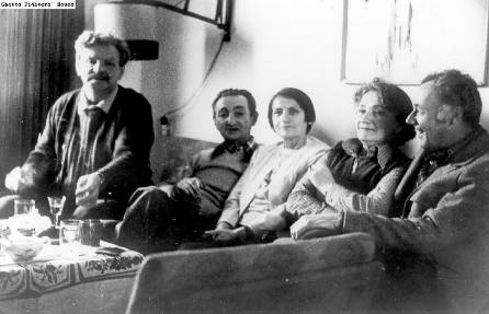 צביה לובטקין עם חברים בביתה בקיבוץ לוחמי הגטאות. צולם כ-3 חודשים לפני פטירתה. בתצלום, מימין לשמאל: שמחה רטהייזר-רותם (קז'יק), לובה גוויסר, צביה לובטקין, מארק אדלמן, יצחק צוקרמן.