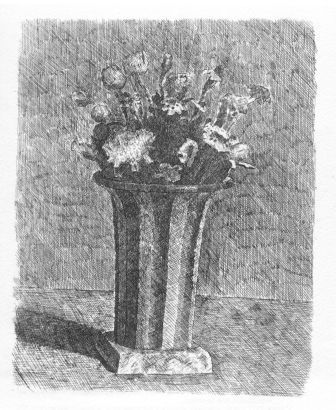 לקצה הגבעול של הפרחים דבוק כביכול קצת חומר (יותר מזה, המדיום [תחריט] מאבּן אותם מעט, כמו נוצקו בגבס), ובתוך האגרטל הזה נושם פרח. ראה איך החושך הכמוס במגרעות העולות של האגרטל מגיח ומלבלב בינות לפרחים, מגיע לשם מחוץ לנייר, בזרימת הצל בשמאל, כאספקה של חושך שמקורהּ עלוּם.