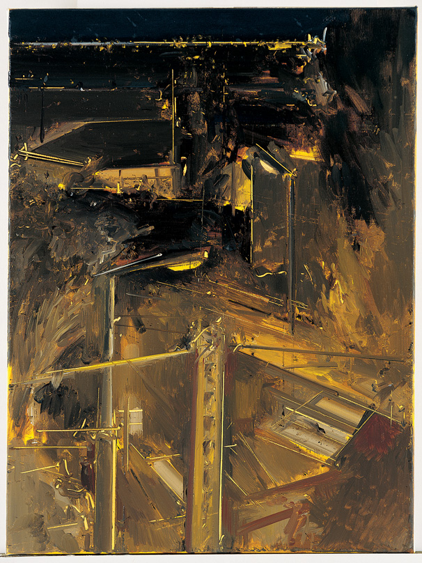 מאיר או מואר? שהרי הפנס מקבל את אורו מהכבל, אבל, בציור, גם מוֹסר לו אור. הנה, אולי זה העניין בתמצית, בתערוכה הזו ובציור בכלל: תחלופה של אורות. מעגל חשמלי. מן הצד השני, פנס רחוב אחר, תאום, כמו שני הולכי רגל של חצות המנופפים לשלום זה לזה משני עברי הכביש, או ככלבי לילה הנובחים זה אל זה. אני חושב על המשמר של הפתיחה של "המלט". ראו את הקו האלכסוני הצהוב, המפעים, על הפנס המרוחק יותר, כתמרור שטרם הומצא, תמרור של אור המורה אל השמיים ואל פס אורות שבמרחק. אורות רחוקים, שמכאן נראים כאור אחד, כנורת ניאון אחת ענקית המשתרעת כענקית רחבה ודקה לכל מלוא האופק. ועמוד החשמל הקרוב, על שתי זרועותיו הפרושות כמאזניים, שוקל את העיר כולה שהפכה לפס-אופק רחוק, כאֵל ששליחותו עלומה, הפורש כפיים של חושך ואור וקורא למרחקים.