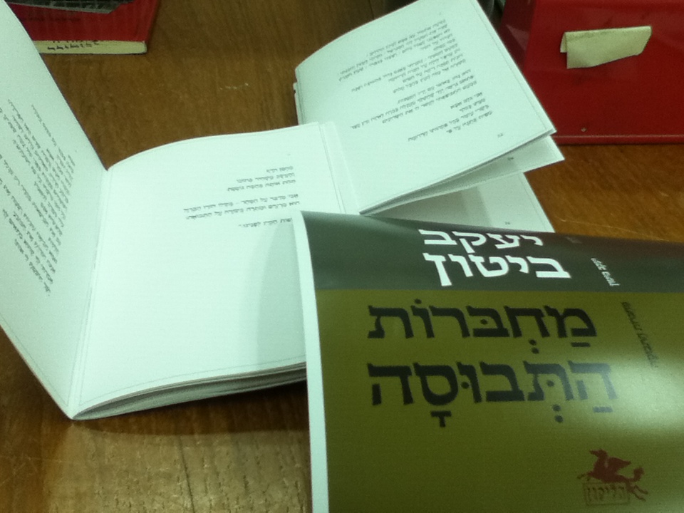 אתמול ישבתי בבית הדפוס של אלי אורן בשדרות רוטשילד 109 בתל אביב לבדיקה אחרונה של "מחברות התבוסה", הספר של יעקב ביטון שאנו מוציאים ב"הליקון" בשבוע הבא. על השולחן היה הכול מפורק – העתקי שמש, דוגמת הדפסה ("אייריס") של הכריכה (השווא החסר בבי"ת יתווסף, הייתי צריך אותו למשהו אחר לרגע). רוב האנשים אינם מכירים את הספרים שלהם במצב כזה. הסתכלתי בסוס המכונף, הלוגו של הליקון, והיה נדמה לרגע שהוא ממריא אל איזה ספר אדום שהיה שם על השולחן. דוהר-עף בשדות הירוקים של הכריכה או מעליהם, מעבר להרים הלבנים של דפי הספר הזה. ונזכרתי באחד השירים מן הספר: