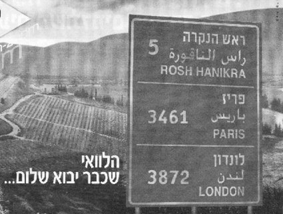 המרחקים הנקובים בשלט אינם נכונים. הם מבטאים כנראה מרחק בקו אווירי, ולא בקו נסיעה יבשתית. המרחק לפריז בדרך היבשה (תלוי איך נוסעים – דרך ירדן וסוריה בכביש המהיר או דרך כביש החוף הלבנוני, בפקקים) הוא לפחות 4,200 ק"מ. לא מפתיע שהוגי המודעה, שהתיימרו לתאר מסע יבשתי, ממשיכים לחשוב במונחים של טיסה. בעבורם הנסיעה בעידן השלום היא כמו דרך מנהרה, שבה הדרך לא חשובה, רק היעד. מתוך דרך מחשבה כזאת על העתיד לא סביר ש"יבוא שלום" בהווה, מפני שהשלום הנכסף מוגדר מראש כמצב של ניכור, של ריחוק, של התעלמות מהמרחב, כלומר השלום מוגדר מתוך הלך הרוח של מצב המלחמה. ואם הפנטזיה על שלום, כפי שהמודעה מבטאת, היא בעצם תודעת מלחמה, מה הסיכוי להגשימה? ובעצם, מה הטעם בהגשמתה?