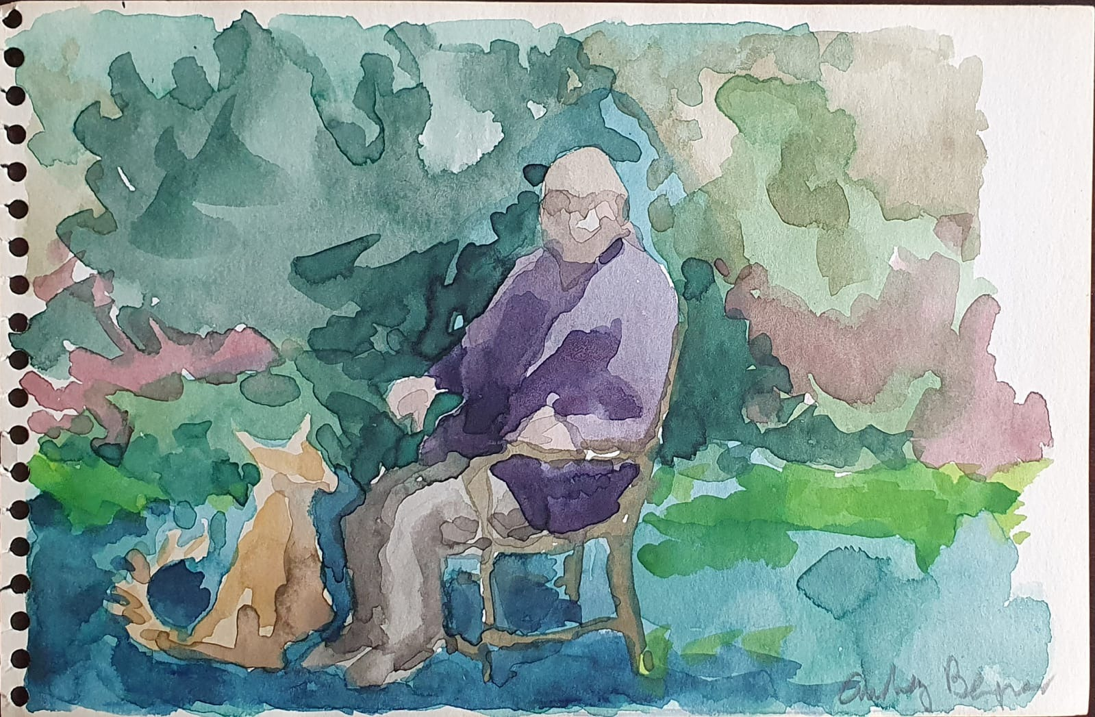 בסדרה הקטנה הזו אנו פוגשים באב בכמה מצבים. הציירת מתמודדת עם המתח של מבט האב בכמה דרכים. ראשית, הוא לא מביט בה ישירות. הוא לרוב שקוע בעולמו, והציור המהיר הוא כמעט הצצה. גם כשנדמה שהוא מסב ראשו אל הציירת, ראשו ומבטו הם כתמים של צבעי מים; כך הוא מתרכך מאוד, נהיה מעין ענן עדין.