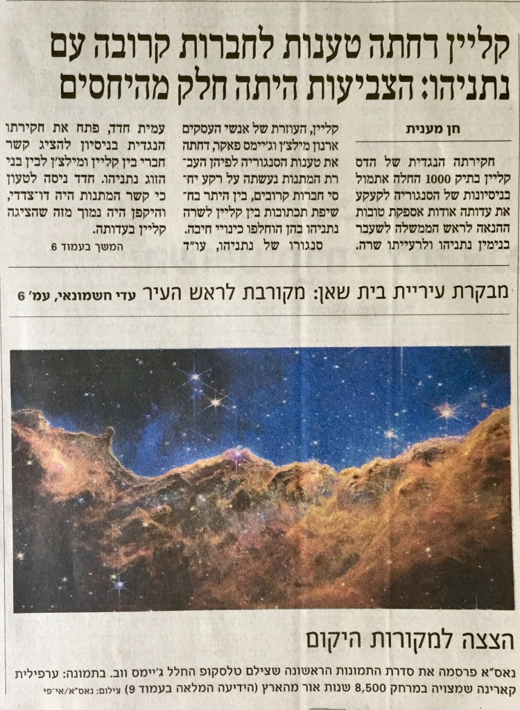 ובאותו עניין. מצורף כאן תצלום מהעמוד הראשון של "הארץ" מהיום. בית שאן, צביעות כשיגרה… ו"הרים" של ערפילית בחלל ש"גובהם" 7 שנות אור. איך יכול להיות שאנו יכולים לקרוא עמוד כזה בלי לפרוץ בצחוק או להתפלץ? (אני צחקתי בבהלה). איך אנו מסוגלים להעמיד על אותו מישור-דף ותשומת-לב דברים כל כך שונים?