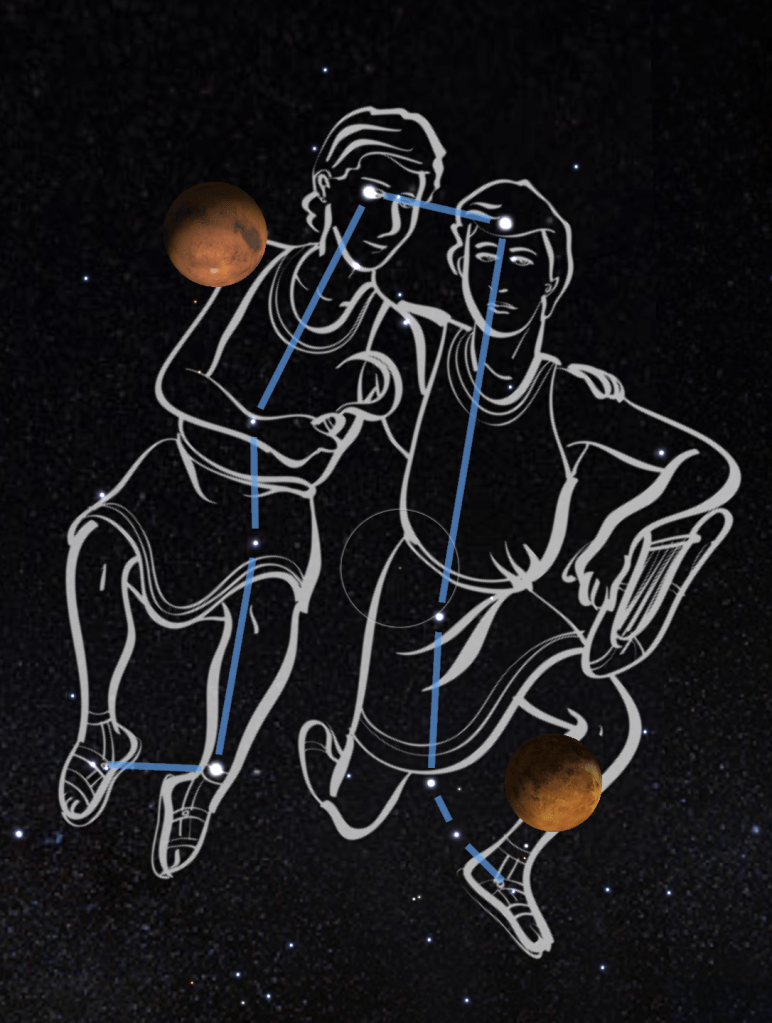 לאחרונה ראיתי בשמֵי המערב את נוגה ומאדים לצד שני התאומים, קסטור ופולוקס. ונוס, כוכב היופי והאהבה, לצד מארס, כוכב הדם והמלחמה. כוכבי התאומים, שעל פניהם חלפו מאדים ונוגה, כמו הסבירו – אולי בלא צורך – גם את היותם של ונוס ומארס צמד.