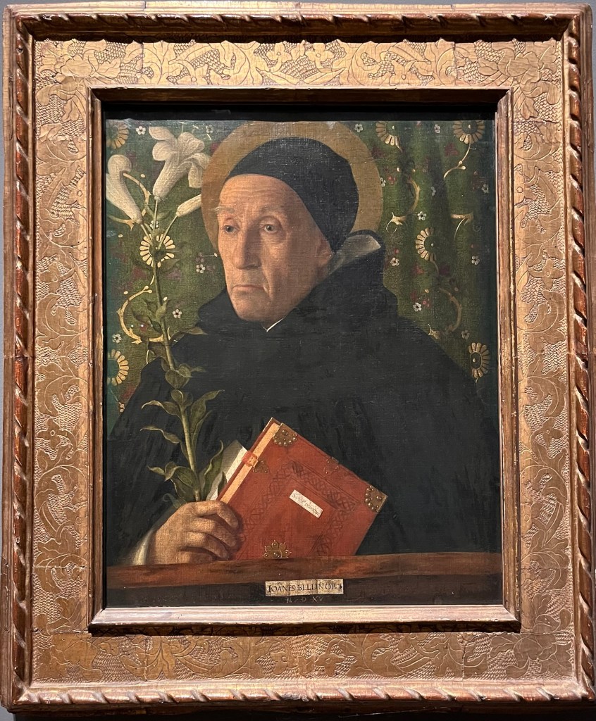 אבל בתוך כל הפריחה הזו והאור קמל המבט. מבטו של המצויר (האח תאודורו מאורבינו, המצויר כאן כקדוש דומניקו) בוהה בעצב ובתימהון, ברוח נכאים. הוא מוקף פרחים ואור אך עיניו אינן פורחות ואינן מאירות. העצב ודאי אכן נשקף מפניו של תאודורו, ואולי גם ניתן לו מן הצייר, שצייר את הציור הזה בגיל המופלג 80, לא הרבה לפני מותו ב-1516. זה הדיוקן האחרון של בליני. הוא אולי אינו יודע שזה יהיה האחרון, אבל אולי הוא יודע או חש משהו אחר.