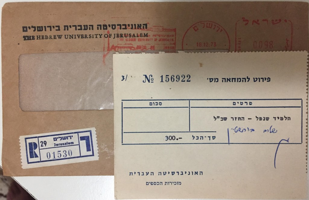 חודשיים לאחר תום המלחמה קיבלו סבי וסבתי מן האוניברסיטה העברית מעטפה חומה ובה החזר על מקדמת שכר הלימוד ששילם בנם, על סך 300 לירות. מצאתי לאחרונה את הספח להמחאה במעטפתו. את הכתוב, הֶחזר שכ"ל, שפירושו כמובן החזר שכר לימוד, איני יכול שלא לקרוא כ"החזר שָׁכַל", החזר למי ששכל.